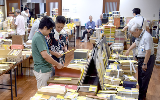 和本とは、狭義には江戸時代に作られた本を指しますが、広義には明治の物も含む、本、浮世絵、古地図、古文書など、書写あるいは印刷された物の総称です。その性質上当然再生産は出来ませんが、古典会の市会では馴染みの無い人が見れば驚くほどに毎回江戸時代以前の物が多数集まります。これは古典会員及び全国御同業の尽力もさる事ながら、古都京都の土地柄も少なからず関連していることかと思います。これら和本類の中には一目見て多くの方が美しい、骨董価値がありそうだと思える物もあれば、傍目には古い・汚いとしか映らないであろう物もあります。 その様な、ややもすれば不当に扱われかねない歴史的資料に正当な光を当てるため、また今日的市場価値では測れない物を次世代へ繋ぐべく、京都古典会では日々研鑽を積んでおります。